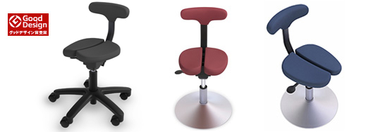 特許取得。特殊な形状の小さな座面に脚を開いて座ることで坐骨で座る形となり、骨盤を立てた理想的な姿勢がつくられ、腰や肩など身体への負担が軽減される。