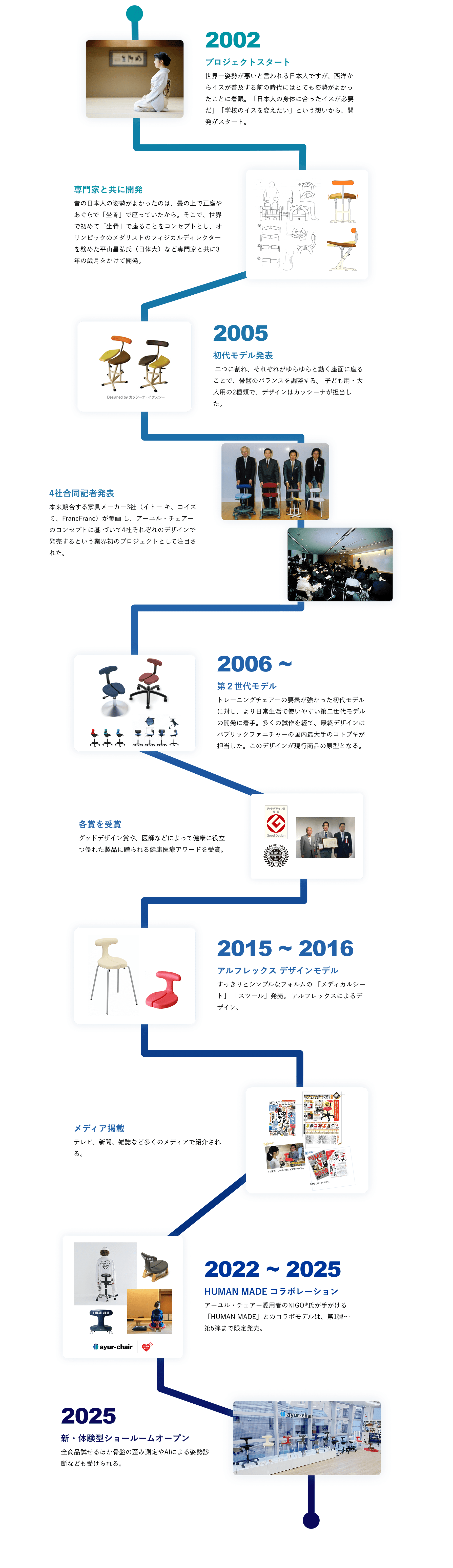 日本人特有の姿勢の悪さ、日本人と欧米人の身体特性の違いに着目し、オリンピックメダリストのフィジカルディレクターを務めた平山昌弘氏などの専門家とともに3年の歳月をかけて開発された。2005年特許を取得(第3733369号)。2007年にグッドデザイン賞、2018年には医師から優れた製品に贈られる健康医療アワードを受賞している。